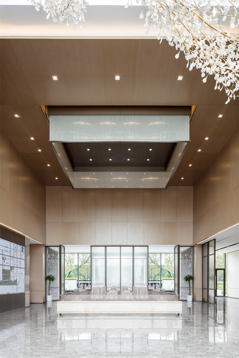 藝術和自然總能在某個節點美妙結合。陽光透過玻璃帷幕躍進室內,將花型裝置渲染得明亮生動。溫潤內斂的淺色系大理石,在燈光的映襯下,與銅色金屬碰撞出輕奢質感。洽談區延續了雅致、輕奢的質感,用金屬、木質、大理石、玻璃、皮、布藝等材質打造空間的豐富體驗,利用材質的軟與硬、剛與柔對比出空間的層次感。