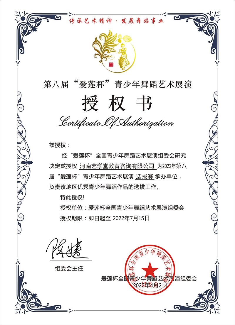 近日,河南藝學堂被授予“曹燦杯”全國青少年朗誦展示活動優秀合作單位、2022年第八屆“愛蓮杯”青少年舞蹈藝術展演選拔賽承辦單位稱號。