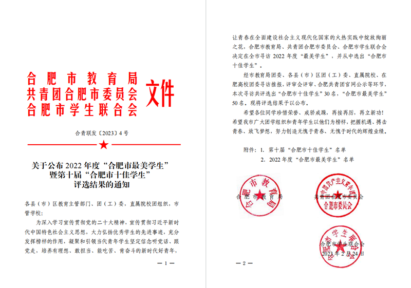 為深入學習宣傳貫徹黨的二十大精神,宣傳貫徹習近平新時代中國特色社會主義思想,大力弘揚優秀學生的先進事跡,充分發揮榜樣的作用,近日,由合肥市教育局、共青團合肥市委員會、合肥市學生聯合會聯合開展的2022 年度“合肥市最美學生” 暨第十屆“合肥市十佳學生” 評選結果出爐。我校高二(1)班郁子超同學獲評“合肥市最美中學生”稱號!
