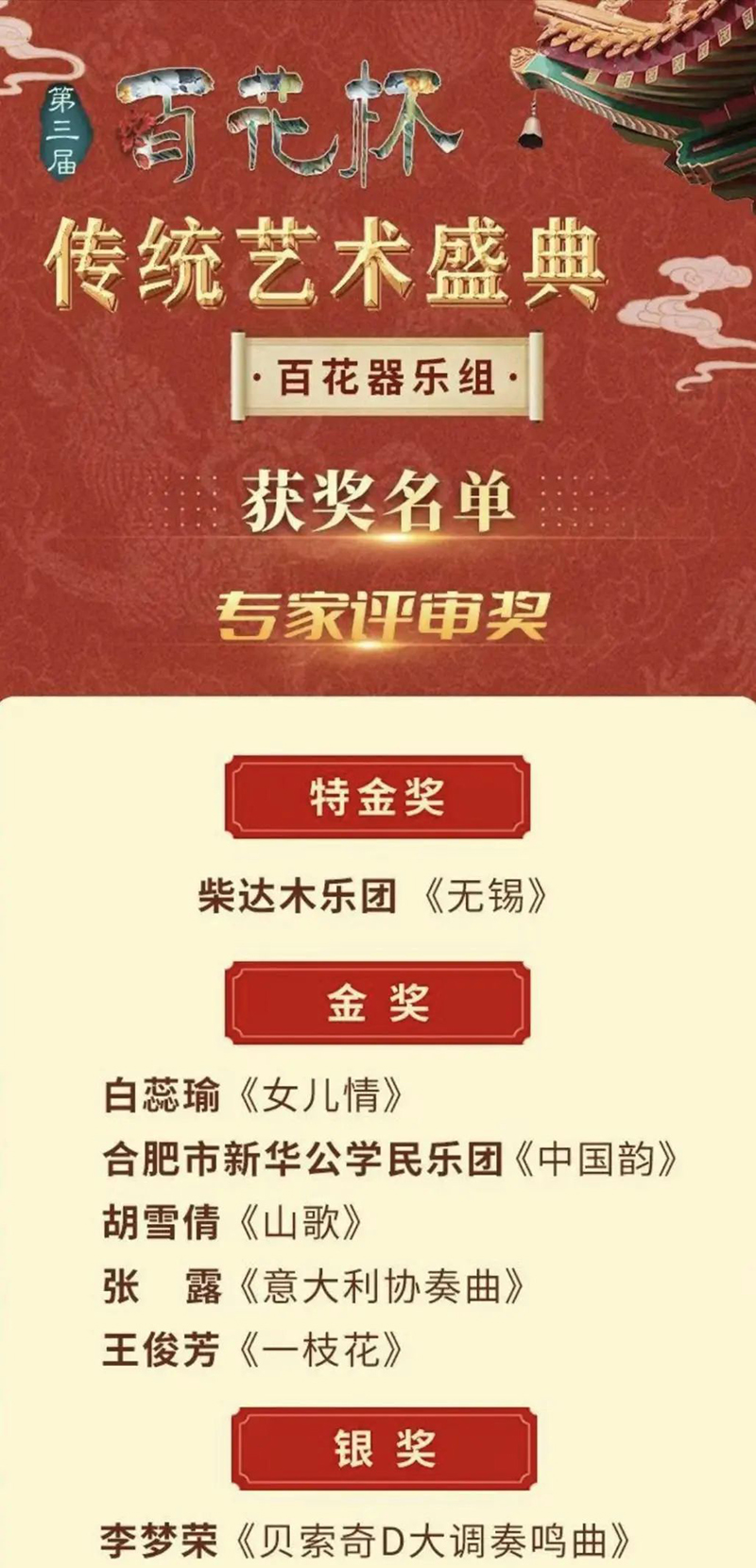 在百花獎頒獎典禮的舞臺上,新華公學民樂團的同學們精神飽滿,演奏了經典曲目《中國韻》。他們的演奏如行云流水,音符間傳遞出深厚的民族情感,展現了極高的藝術水準。現場觀眾沉浸在美妙的音樂中,掌聲雷動。最終,憑借精彩絕倫的表演,新華公學民樂團脫穎而出,榮獲金獎。