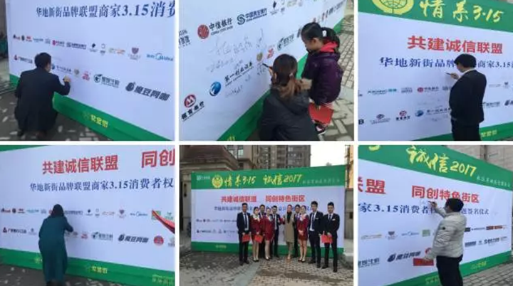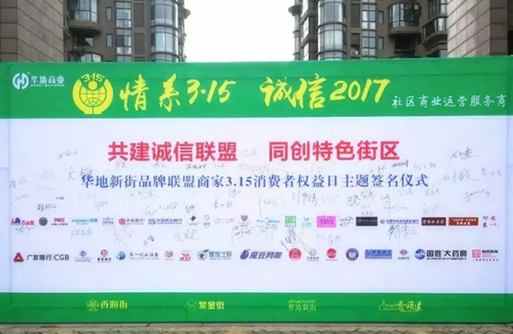 2017年3月15日,“華地新街品牌聯(lián)盟商家3·15消費(fèi)者權(quán)益日”主題簽名儀式在華地新街隆重舉行。上午10時,各商戶代表齊聚在品牌墻下,由商業(yè)公司工作人員向大家宣讀并發(fā)放《倡議書》,各商戶代表在品牌墻上鄭重簽名,為共建誠信聯(lián)盟,共創(chuàng)特色街區(qū)而簽下鄭重的承諾。