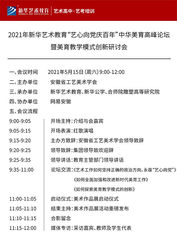 此次高峰論壇暨研討會由安徽省工藝美術學會主辦,新華藝術教育、新華公學、合師院雕塑高等研究院承辦。屆時,擬邀眾多全國著名藝術家和大學藝術教授聚首合肥、巔峰論道,給大家帶來一場美育教學模式創新的“思想盛宴”。