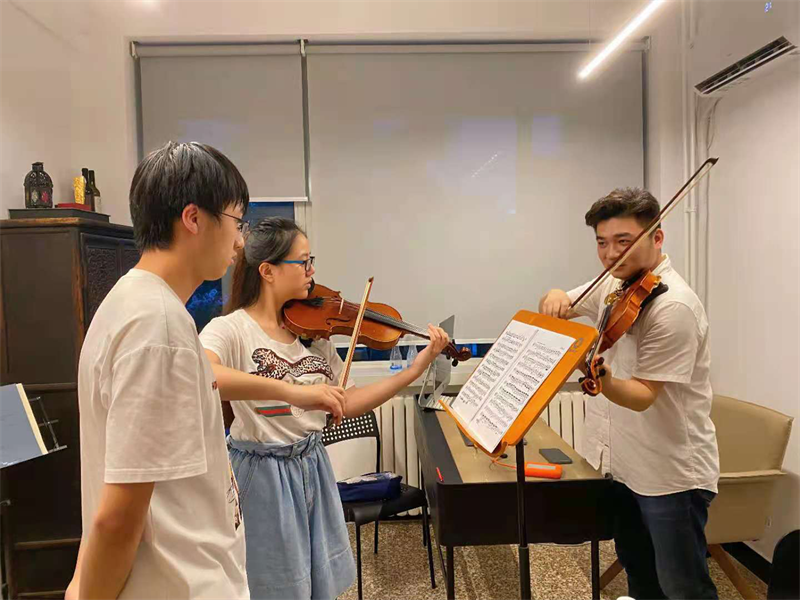 717號兩位同學到達北京,我們邀請到中央音樂學院副教授、琥珀四重奏中提琴演奏家,德國柏林藝術大學博士獨奏家文憑獲得者戚望教授給兩位同學進行賽前指導。戚望教授在指導中指出合作的意義,并針對兩位同學的不足進行了示范以及講解,并且為兩位選手加油鼓勁。
