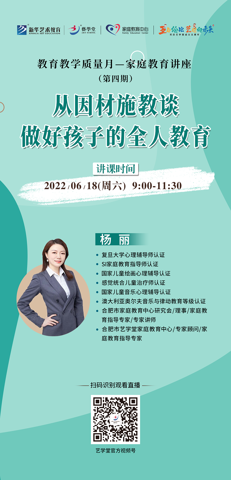 此外,藝學(xué)堂教育教學(xué)質(zhì)量月—家庭教育親子類線下講座將于6月18日上午9:00準(zhǔn)時(shí)開講。我們將邀請(qǐng)家長現(xiàn)場聆聽,僅限50名,歡迎各位家長積極報(bào)名~