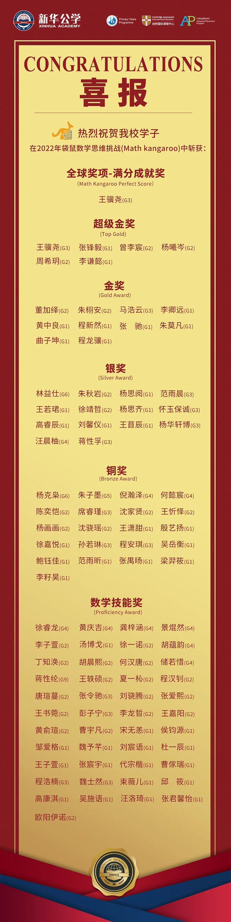 袋鼠數(shù)學(xué)思維挑戰(zhàn)賽成績(jī)新鮮出爐,新華公學(xué)97人摘得獎(jiǎng)項(xiàng),其中1人斬獲全球最高獎(jiǎng)項(xiàng)——滿分成就獎(jiǎng)!