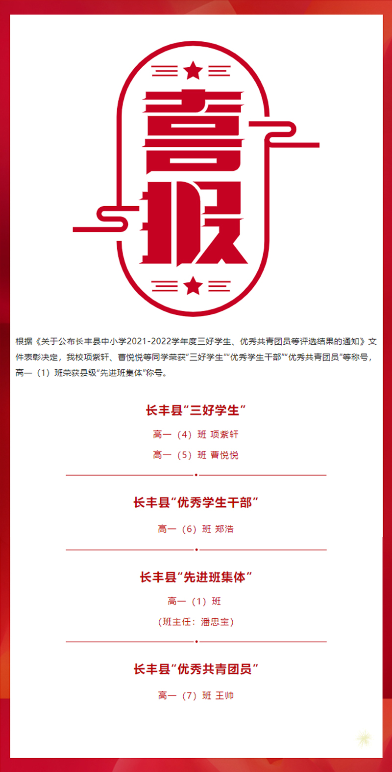 【喜報】我校在長豐縣2021-2022年度三好學生等評優表彰中取得優異成績